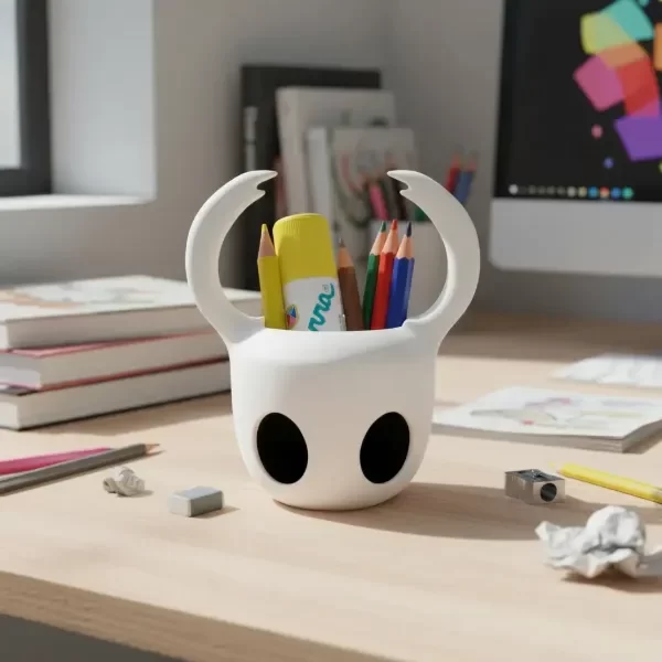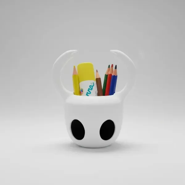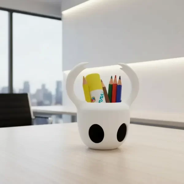 Organizá tu escritorio con estilo y originalidad gracias a este portalápices inspirado en el personaje Hollow Knight, fabricado mediante impresión 3D.