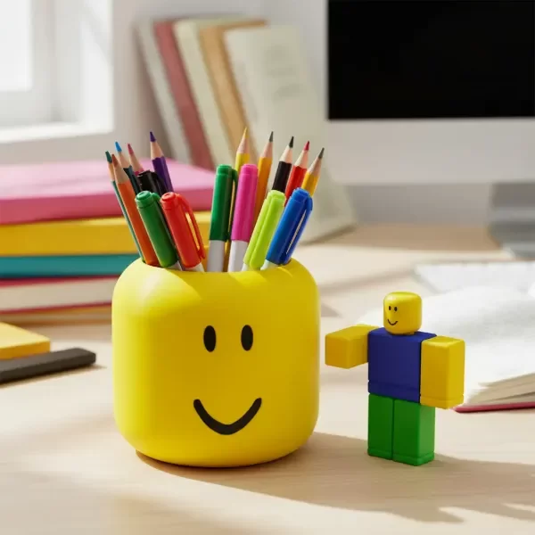 El icónico "Noob" (novato) de Roblox salta de la pantalla para ayudarte a mantener el orden. Este portalápices es el regalo ideal para cualquier gamer que pase horas creando y jugando en el universo de Roblox.