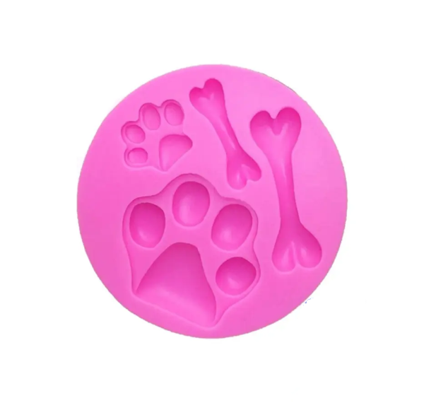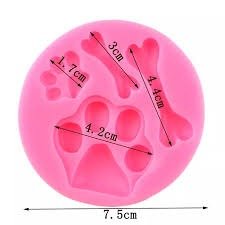 Temática mascotas: 1 huella grande (4,2cm), 1 pequeña (1,7cm), 1 hueso largo (4,4cm) y 1 mediano (3cm). Ideal para identificadores y llaveros. APTO PARA: Resina, porcelana fría y fondant. CUIDADOS: Lavar con jabón neutro.