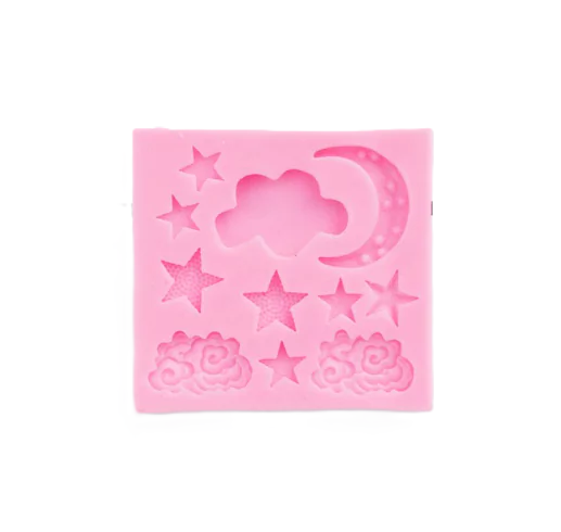 Set con luna creciente, nubes con texturas y estrellas surtidas. Ideal para decoración de cuartos infantiles o "Baby Shower". APTO PARA: Resina, porcelana fría y fondant. CUIDADOS: Lavar con jabón neutro.