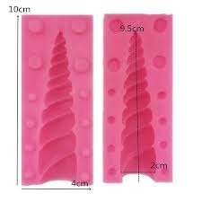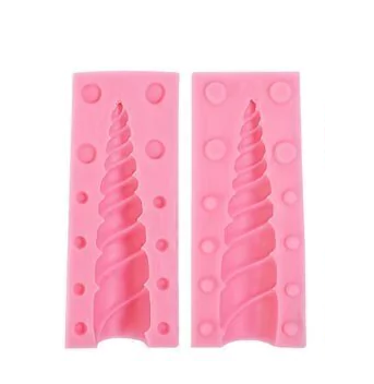 Set de dos moldes complementarios para crear un cuerno de unicornio completo con efecto 3D y espiral. APTO PARA: Fondant, resina y porcelana fría. CUIDADOS: Guardar ambas piezas juntas para evitar deformaciones.
